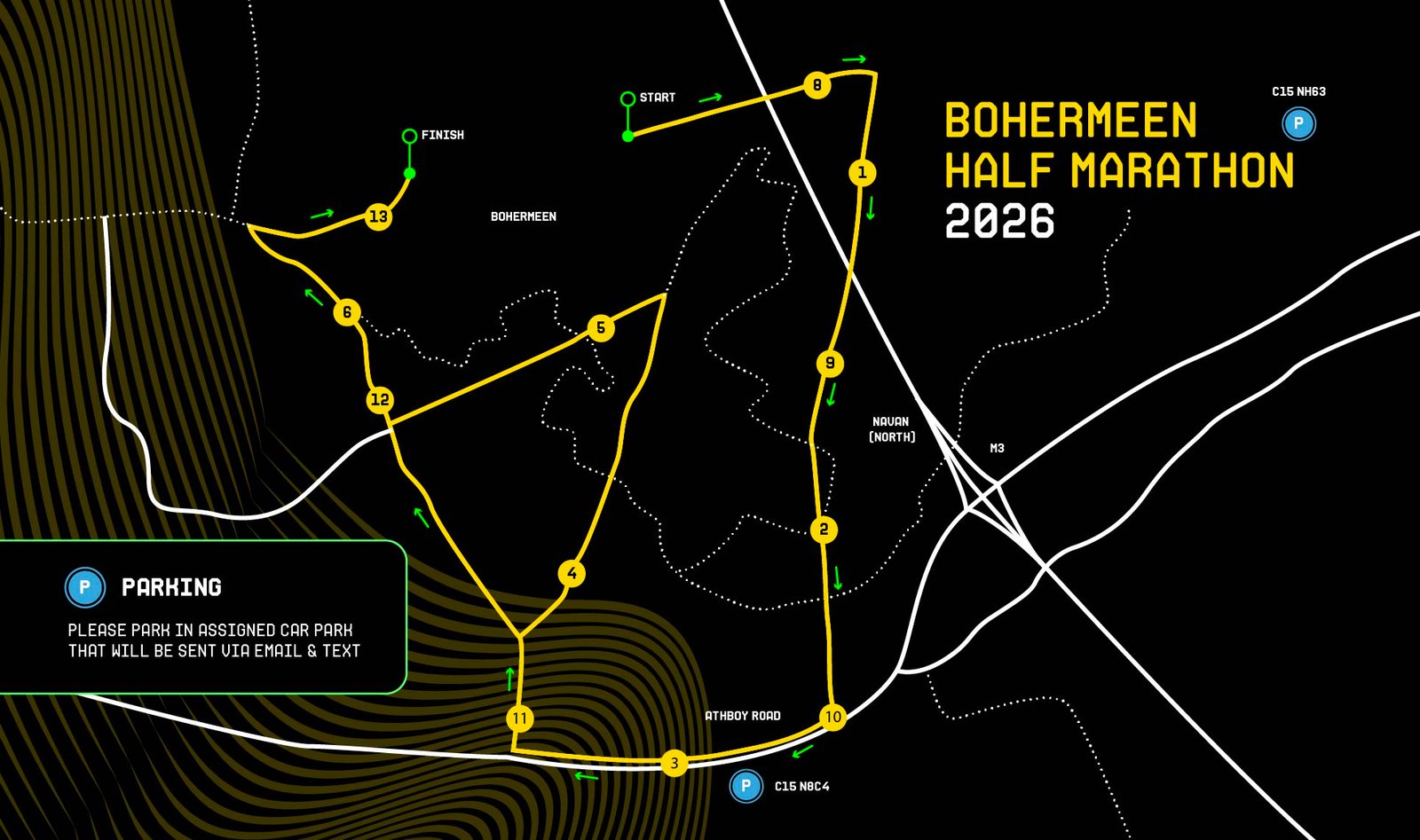 Tara Mines car park C15 NH63 to park (there will be Portaloo’s at the car park) and there will be shuttle buses to the race HQ at Bohermeen community centre. Follow the stewards for parking instructions.